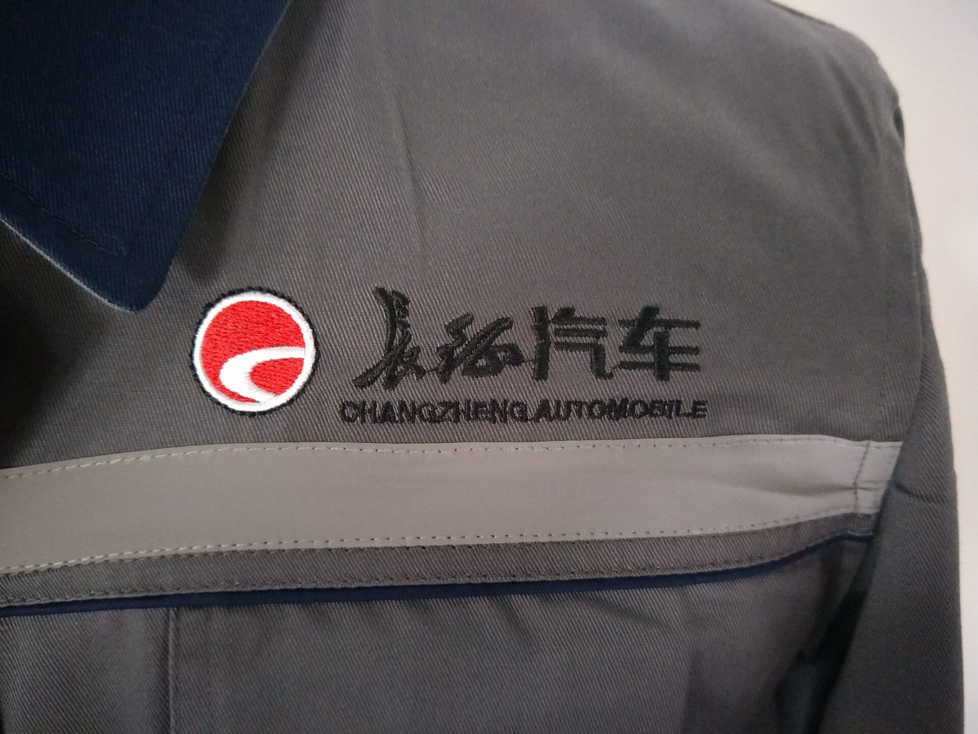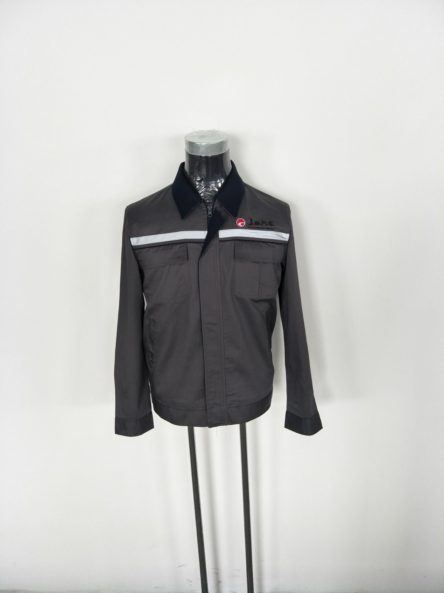 河北长征汽车是一家汽车制造公司。内有员工叁佰多人。每年夏季都要开始定做夏季工作服。夏季工作服分为两种,短袖和长袖。夏季长袖工作服的款式和短袖保持一致。只是袖子长度的区别。目前款式已经确定,产前样已经出品。采用了非常浅的灰色面料拼藏青色的款式。款式图片如下: