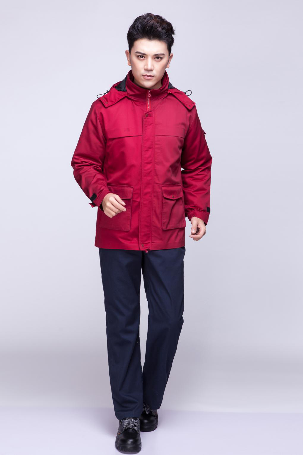 夹克酒红色棉服前后带有反光条,后背带有反光印字。款式虽然很简单,但是电力抢修的四个反光印字是要加上去的。款式图片如下: