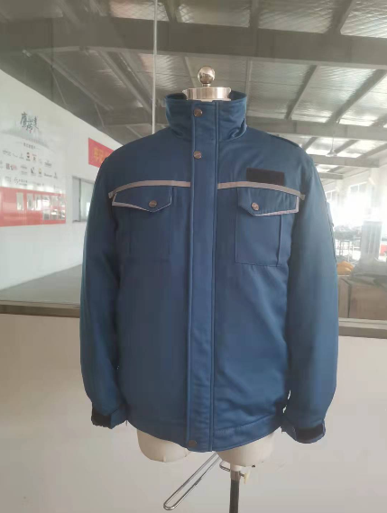 此款是甘肃的化工企业做的夹克款羽绒工作服,内胆是可以拆卸的羽绒内胆,保证员工活动的同时还能抗御寒冷