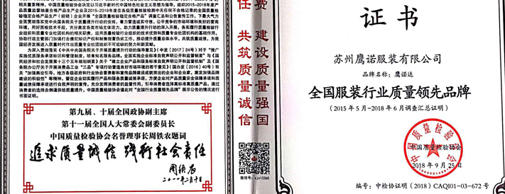 苏州鹰诺服装:【喜报】鹰诺达荣获全国服装行业质量领先品牌